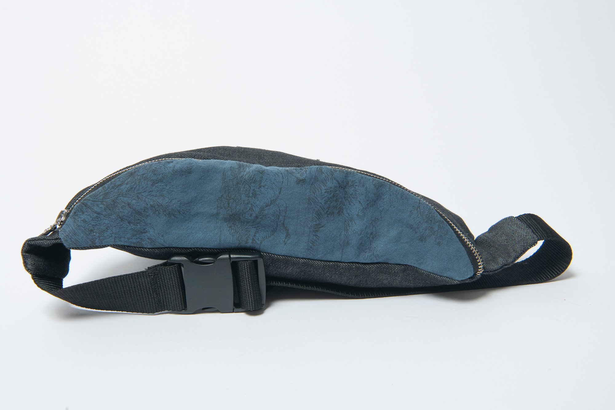 Sac banane cousu main dans notre atelier parisien. Confectionné en denim noir et en toile de Jouy, il allie modernité et élégance intemporelle.