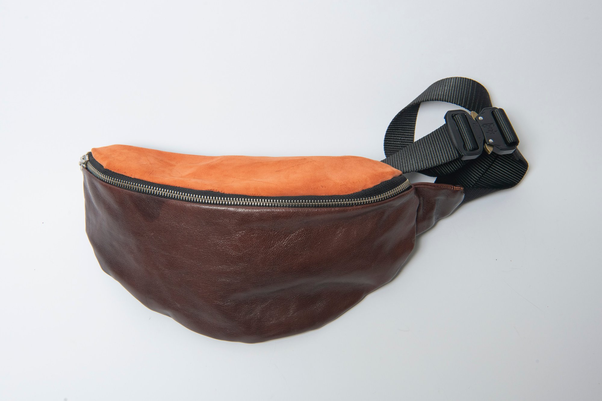 Sac banane cousu main dans notre atelier parisien. Réalisé en cuir d’agneau brun & daim saumon (bi-matière), il se distingue par son toucher souple et raffiné. Reflet d’un savoir-faire artisanal.